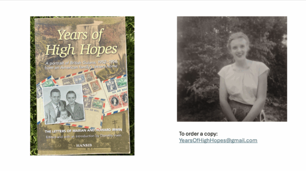 In September 1952 a young American couple, Howard and Marian Irwin, arrived in British Guiana. Howard Irwin was to teach Biology at Queen’s College. They would live in the colony for four years. During their stay, Marian Irwin kept a journal and corresponded by letter with her parents weekly. Her mother preserved the letters which Marian’s daughter, Dorothy, would compile (along with other material) in a book, Years of High Hopes, published by Hansib in 2016.